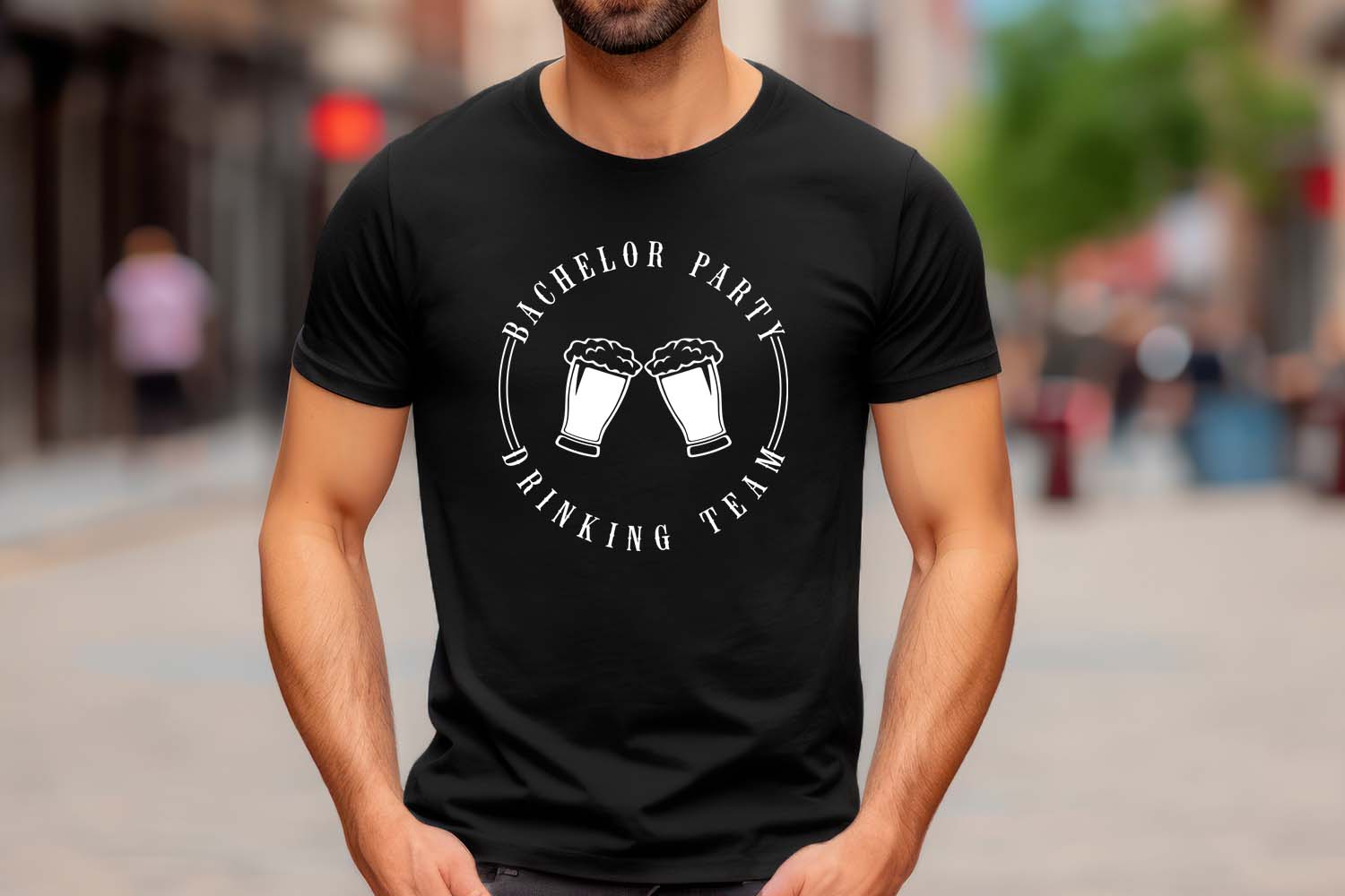 Planning a wild bachelor party? This Bachelor Party Drinking Team T-Shirt is the go-to gear for every groomsman and drinking buddy in the squad. Featuring two clinking pint glasses and clean circular text, it’s a bold, simple design that gets straight to the point — you’re here to drink, and you’re doing it in style.