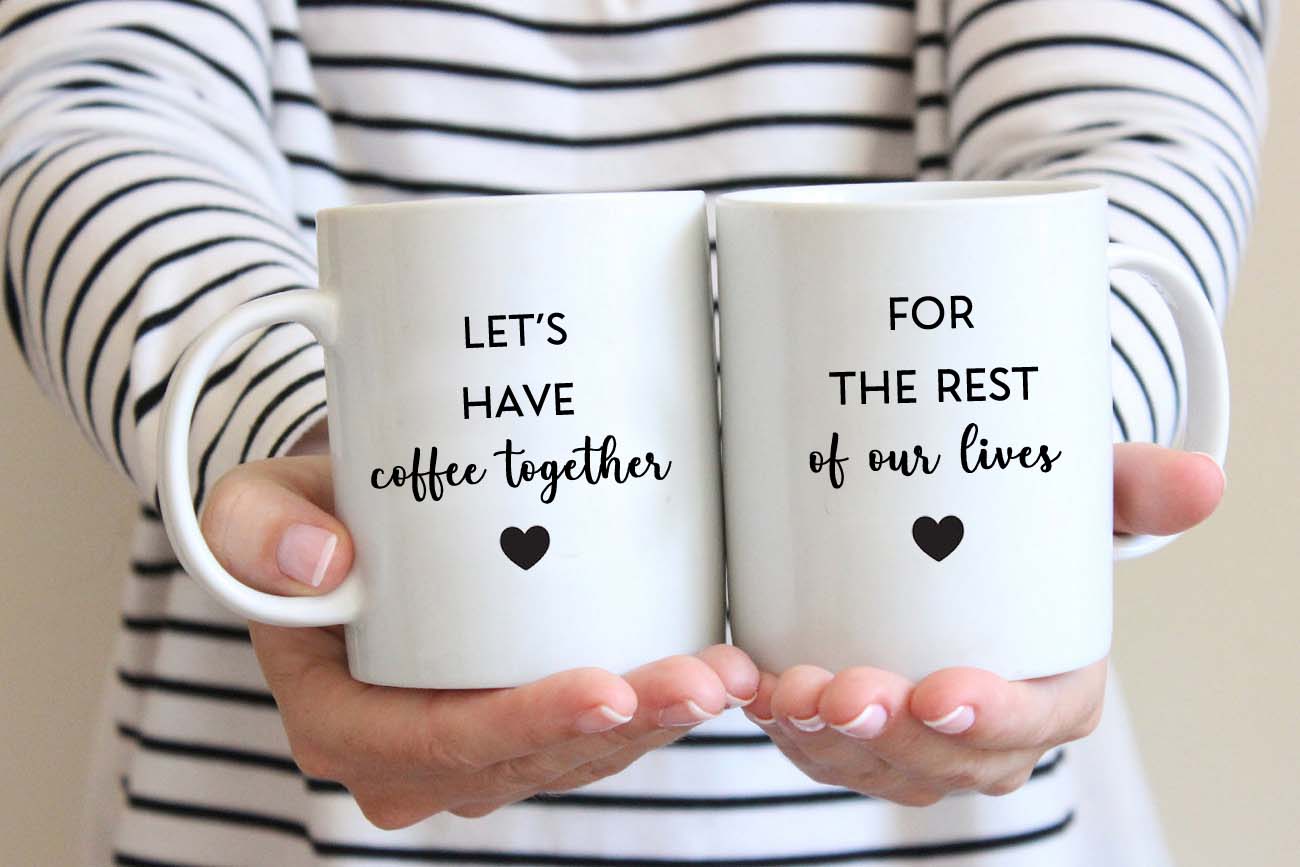 - The lets have coffee together mugs design is sublimated into a special coating on the mug .