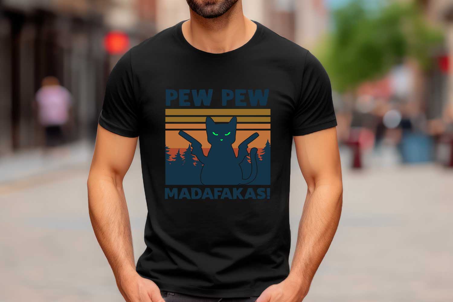 Pew Pew Madafakas Cat T-Shirt – Funny Retro Cat with Guns Tee