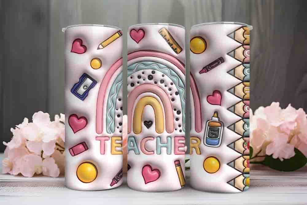 Bring joy to the classroom with our cute teacher tumbler South Africa. Featuring a pastel rainbow, colourful pencils, hearts, and fun classroom icons, this tumbler captures the warmth and positivity that teachers bring every day.