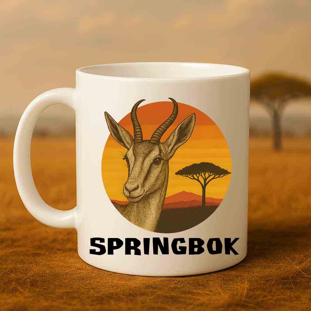 Graceful, agile, and proudly South African — the springbok is more than just an antelope; it’s a national symbol. Famous for its high leaps, called “pronking,” the springbok represents energy, pride, and freedom across the open plains. The Wildlife Mug – Springbok Coffee Mug captures this spirit with a striking springbok design set against a glowing African sunset.
