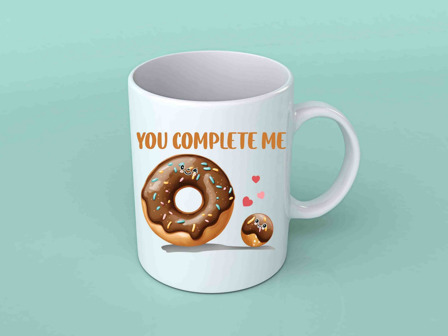 Elevate your expressions of love with our charming You complete me Donut coffee mug Crafted with care, this ceramic drinkware serves as a tangible token of affection, perfect for celebrating the special bond you share with your loved one.
